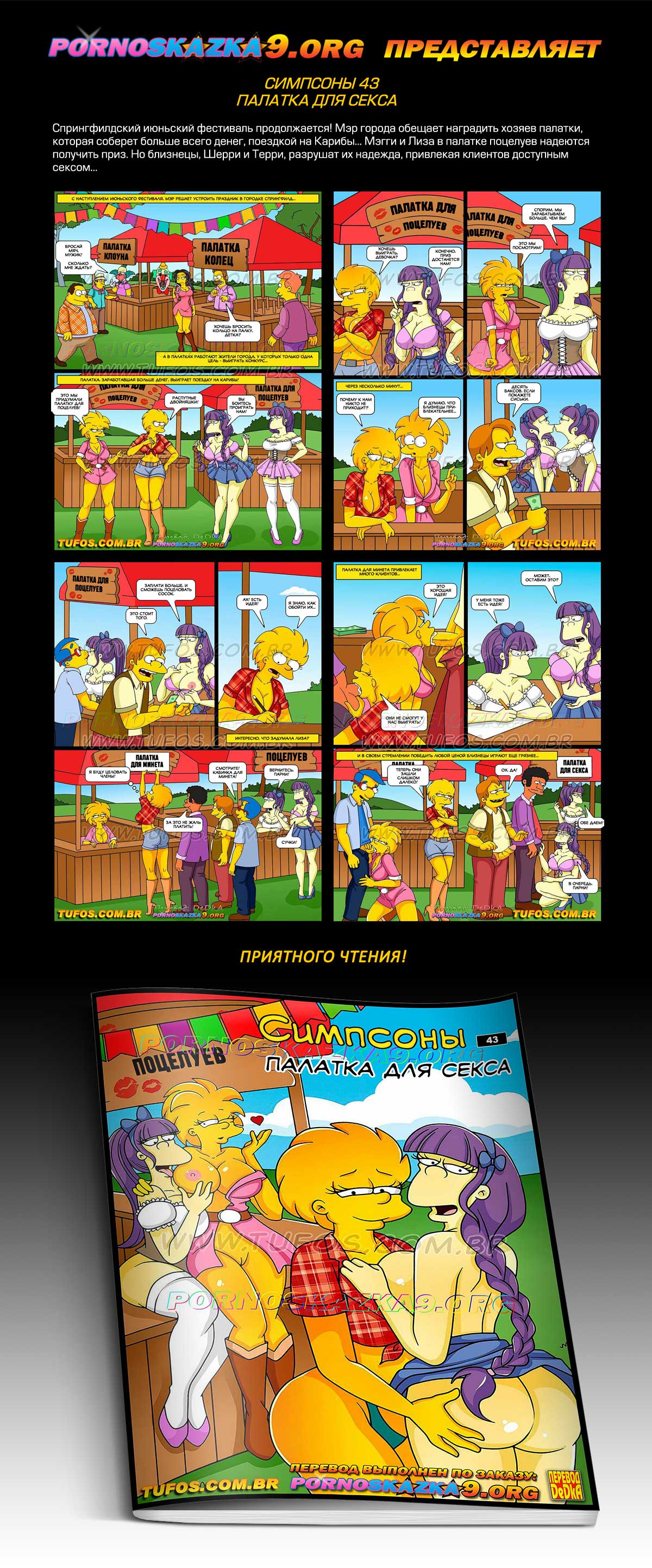 Порно комикс Симпсоны. Часть 43. Палатка для секса. Спрингфилдский июньский фестиваль продолжается! Мэр города обещает наградить хозяев палатки, которая соберет больше всего денег, поездкой на Карибы… Мэгги и Лиза в палатке поцелуев надеются получить приз. Но близнецы, Шерри и Терри, разрушат их надежда, привлекая клиентов доступным сексом…